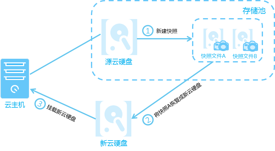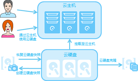 如图-1所示,云硬盘需要挂载至云主机上使用,同时云硬盘支持云硬盘快照与云硬盘克隆功能。