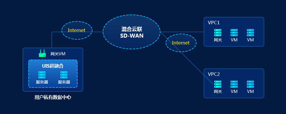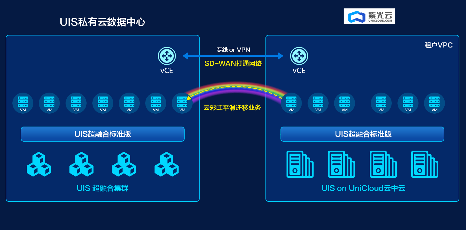 H3C UIS超融合管理平台云上云下基础设施UIS on UniCloud混合云,结合H3C UIS超融合管理平台构建的本地私有云数据中心与在紫光云中部署的UIS on UniCloud云中云,借助SD-WAN实现本地私有云(云下)与UIS on UniCloud云中云(云上)混合云网络高速互联,实现混合云资源统一管理、云彩虹业务平滑迁移、容灾备份等高级特性。