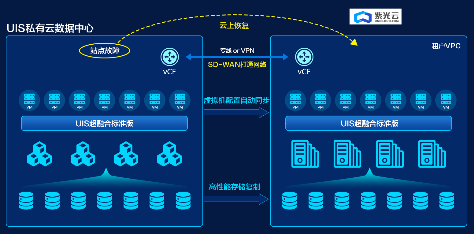使用UIS超融合UIS on UniCloud混合云,进行云上容灾,利用紫光公有云进行私有云的容灾备份;免自建灾备中心,资源按需购买,业务弹性伸缩,极大节省投资成本。UIS站点容灾服务支持无代理实现存储数据复制同步,提供多种容灾场景(计划故障恢复、测试恢复计划、故障恢复和反向恢复等),一键容灾演练,一站式管理私有云本地站点和公有云远端站点,实现虚拟机配置自动同步,极大提升管理便捷性。