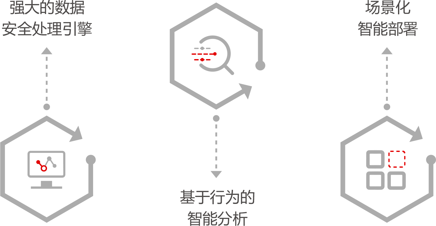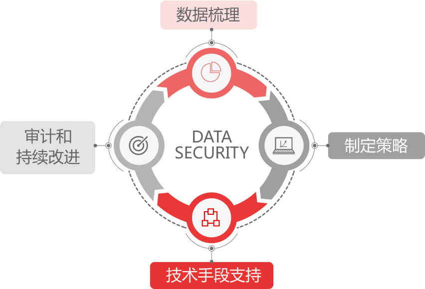 首先协助用户梳理关键数据、进行数据分级分类和风险评估;根据数据梳理的结果协助用户制定策略和管控方法;通过技术手段执行数据安全治理; 最后根据技术实施的结果反向分析并再次指导用户梳理和策略调整,进而形成新华三的数据安全循环防护体系。