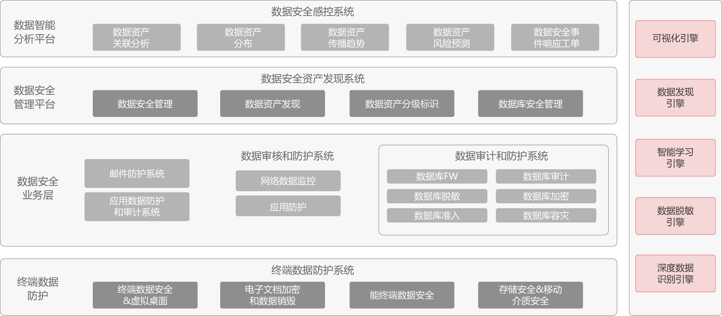 新华三数据安全系统包含深度数据识别引擎、智能学习引擎、可视化引擎、数据发现引擎、数据脱敏引擎五大引擎,以及基于五大引擎构建的数据安全感控系统、网络数据审计和防护系统、应用数据审计和防护系统、邮件防护系统、终端数据防护系统、数据资产发现系统、数据库审计和防护系统七个子系统。