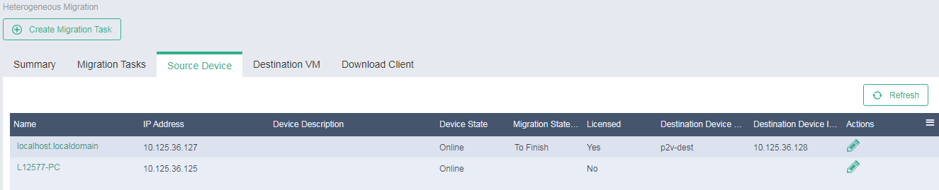After the restart, you can access the Services > Heterogeneous Migration > Source Device page to verify that the source device has been added to the source list.