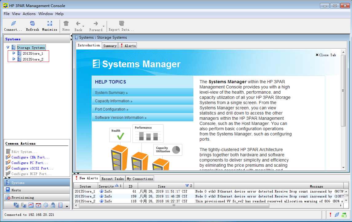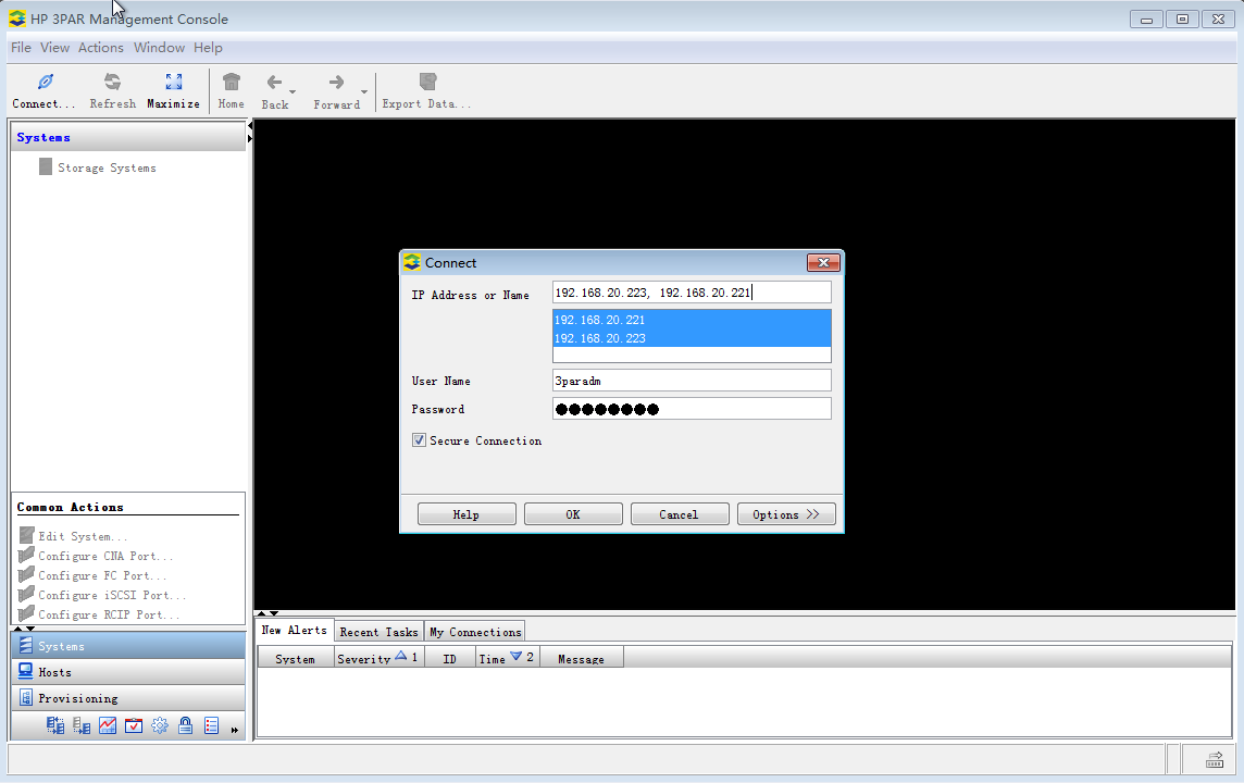 通过HP 3PAR Management Console登录存储。在IP Address or Name地址栏中输入两台3PAR存储服务器的管理IP地址、用户名和密码,同时登录两个存储。