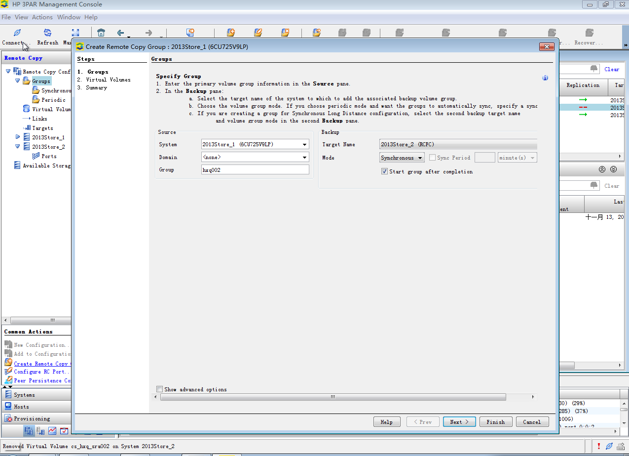 存储卷创建成功后,单击左下角的按钮<Create and management HP 3PAR Remote copy configurations on HP 3PAR storage systems>,开始创建Remote Copy组。
