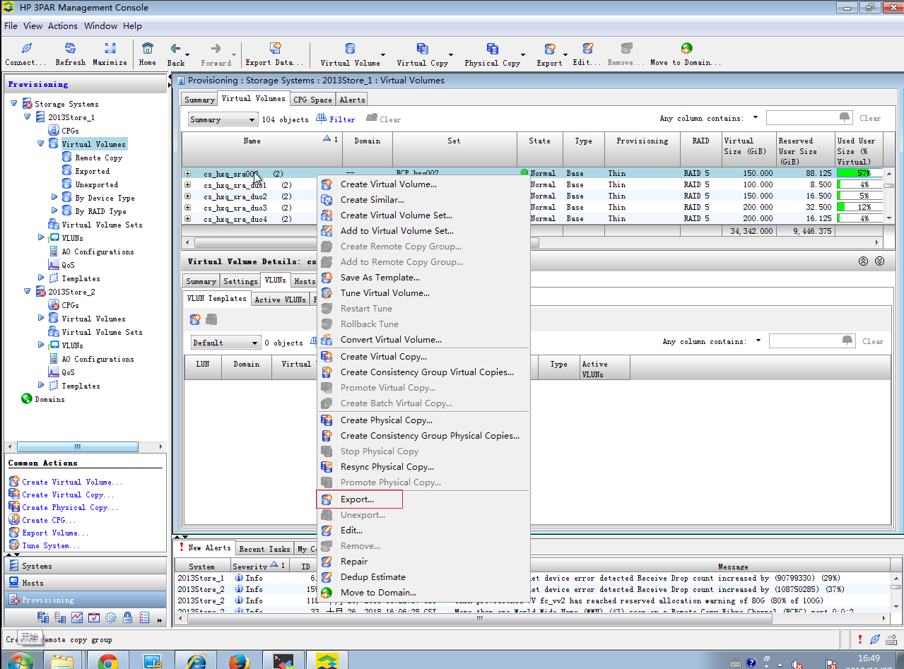 分别在存储2013Store_1和2013Store_2上,选择存储卷cs_hxq_sra002,右键选择<Export>,把存储卷映射给主站点主机和从站点主机。
