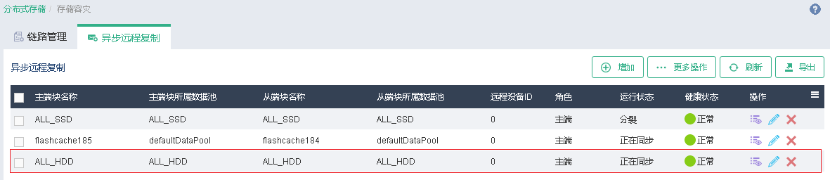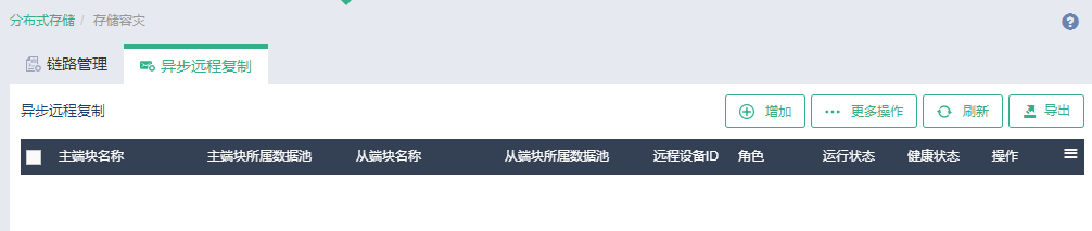 选择顶部“存储”页签,单击左侧导航树[存储容灾]菜单项,进入存储容灾页面。选择“异步远程复制”页签。进入异步远程复制配置页面。
