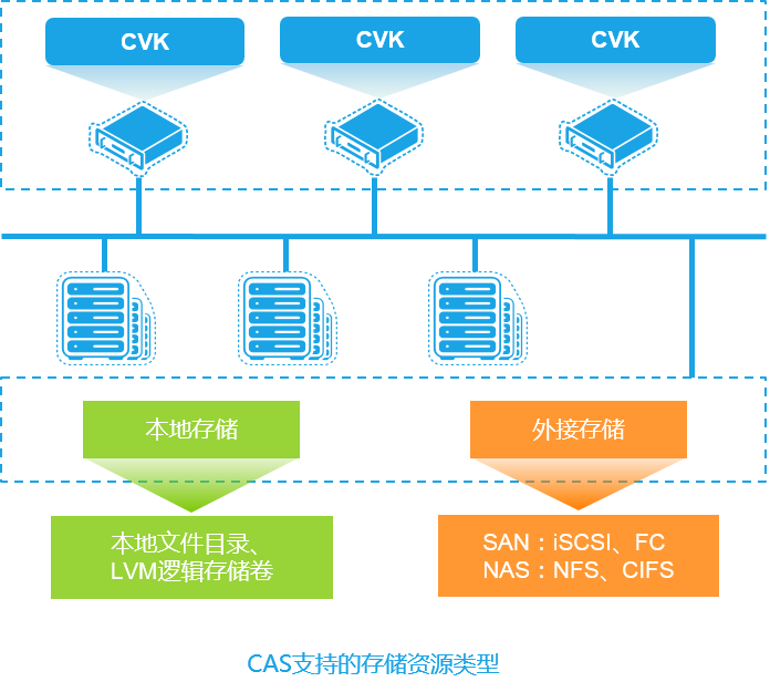 外接存储:物理主机通过高速的网络访问存储系统。外接存储可以实现共享,其数据存储可以同时被多个主机访问。CAS支持多种类型的外接存储,包括IP SAN、FC SAN以及NAS(网络附加存储)。