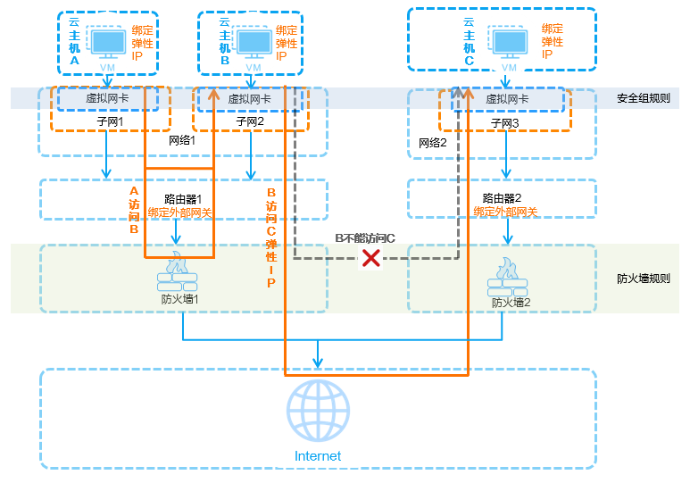 当公网有访问云主机需求时,可为云主机绑定弹性IP,并为云主机所在子网关联的路由器配置外部网关,将路由器关联至防火墙,则该路由器所关联子网的所有云主机均可通被Internet通过弹性IP访问。
