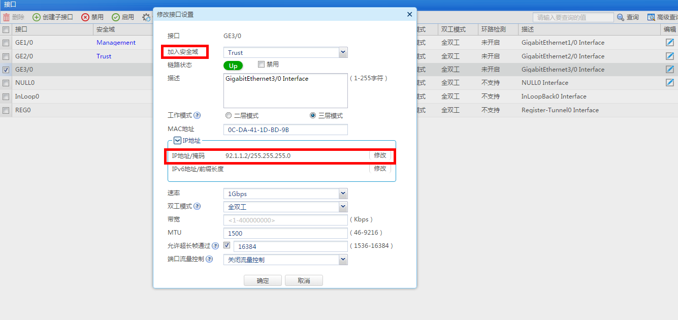 网络接口配置。单击[网络/接口/接口]菜单项,进入物理接口页面,物理接口与管理平台虚拟数据中心拓扑界面网元添加的网卡顺序一致。按照组网图,ge2/0口配置地址91.1.1.2,ge3/0口配置地址92.1.1.2。将接口加入到对应安全域。