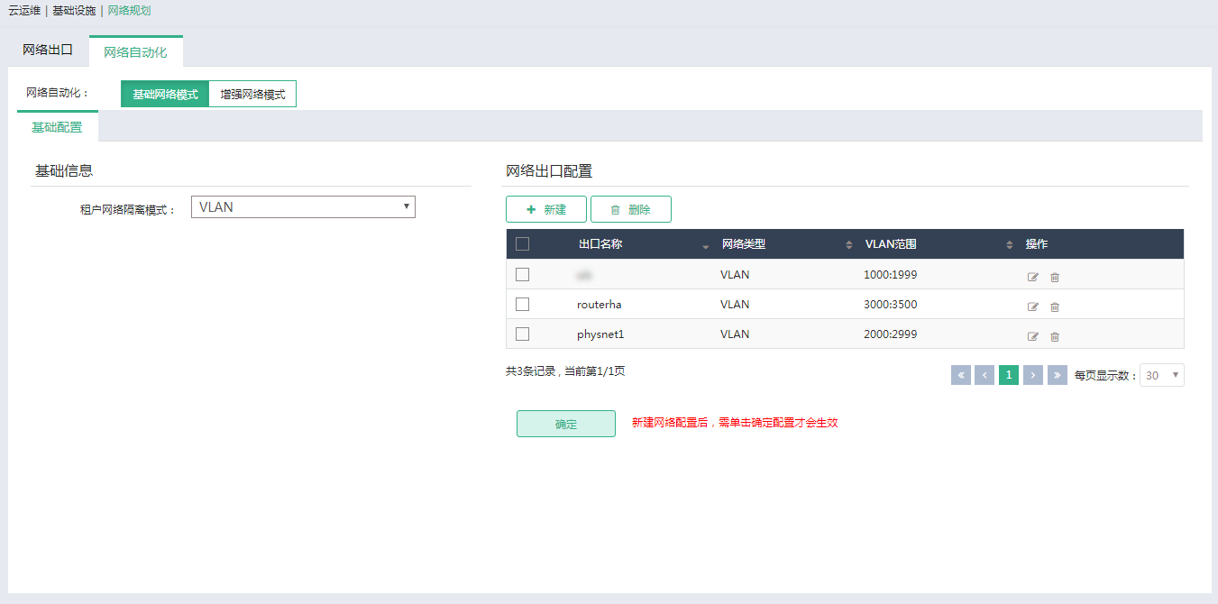 单击顶部导航栏中的[云运维/基础设施/网络规划]菜单项,进入网络规划页面。