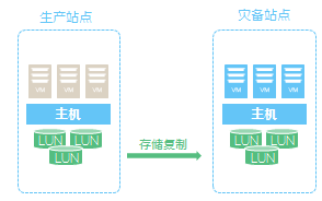 保护组:将属于同一个存储池(对应存储阵列中的一个或多个LUN)的虚拟机划分到一个保护组中。配置虚拟交换机映射、网络策略模板映射和存储的资源映射关系,虚拟机在恢复站点恢复时,自动进行资源替换。