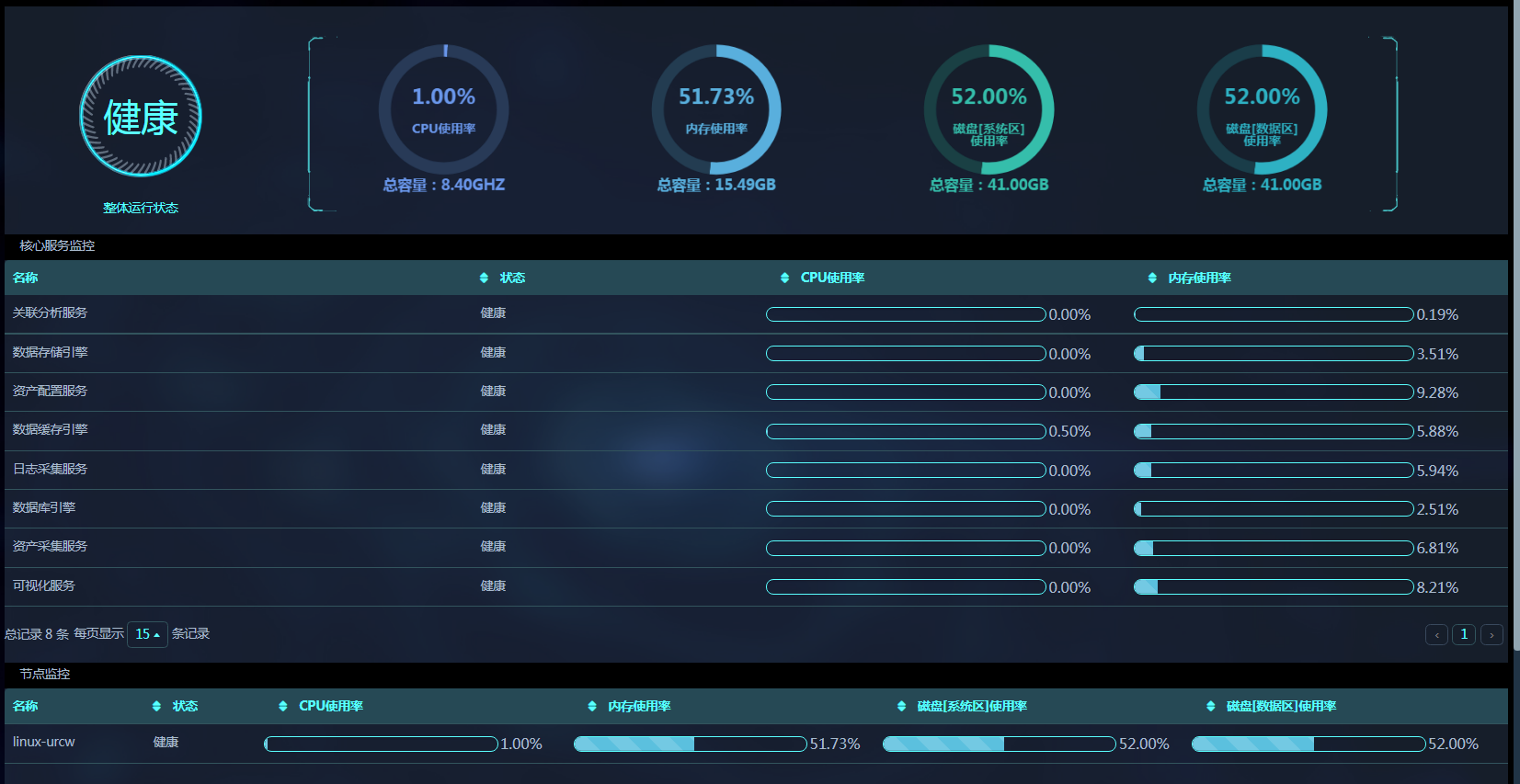管理员可实时监控平台整体运行状态和资源消耗情况,包括平台CPU使用率、内存使用率、磁盘的系统区与数据区的使用率,还可以查看平台的核心服务与各服务器节点的运行状态。