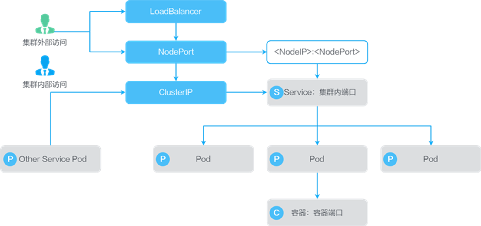 集群内访问(ClusterIP):通过集群IP、Service端口和容器端口访问对应容器。