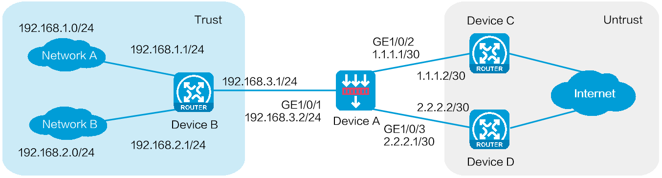 如下图所示,公司在网络出口部署了一台安全网关Device A,内网侧包含网络A(192.168.1.0/24)和网络B(192.168.2.0/24),外网侧租用了由不同运营商提供的线路A和线路B:其中线路A的接入设备为Device C,接入点IP地址为1.1.1.2/30;线路B的接入设备为Device D,接入点IP地址为2.2.2.2/30。需要实现如下需求:
