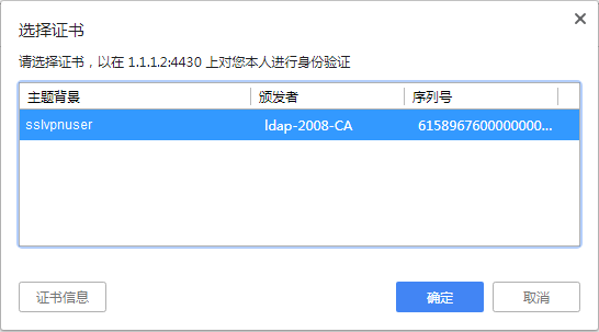 # 单击密码输入框右侧的<选择客户端证书>按钮,选择USBKey中的客户端证书,单击<确定>按钮,如下图所示。