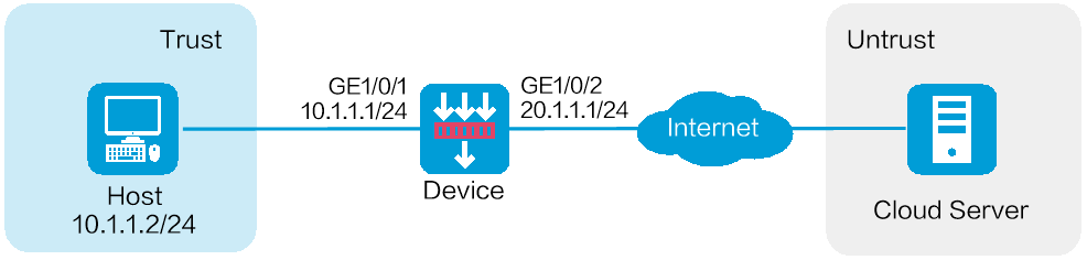 如下图所示,Device分别通过Trust安全域和Untrust安全域与局域网和Internet相连,并能够访问Internet中的特征库云服务器。现在需要通过使能IP信誉功能,根据IP地址信息对网络流量进行过滤。