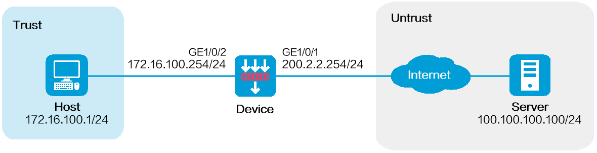 内部用户172.16.100.1/24使用外网地址200.2.2.254/24访问Internet中地址为100.100.100.100/24的Server。