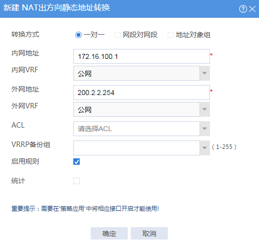 # 单击<确定>按钮,完成NAT出方向静态地址转换配置。