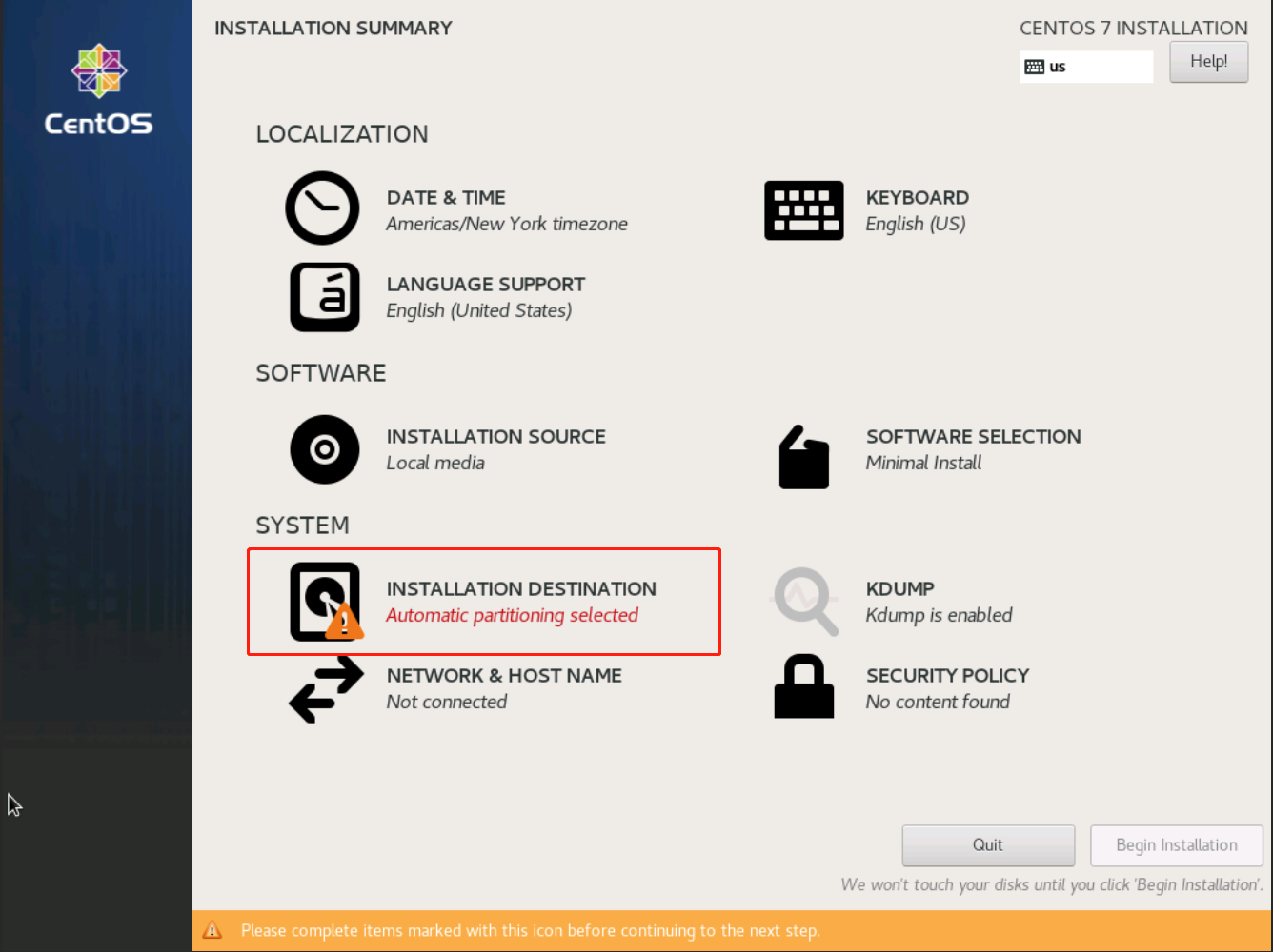 进入安装配置界面,带有感叹号的项(一般是选择系统盘项)必须进行配置,其他项可根据需要选择配置。点击【INSTALLTION DESTINATION】选项,选择系统盘。