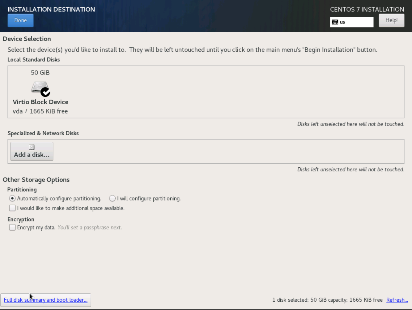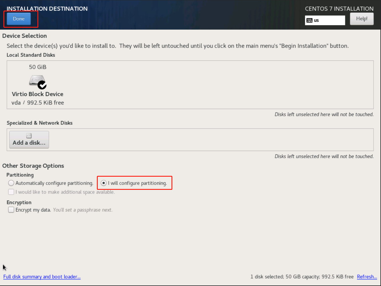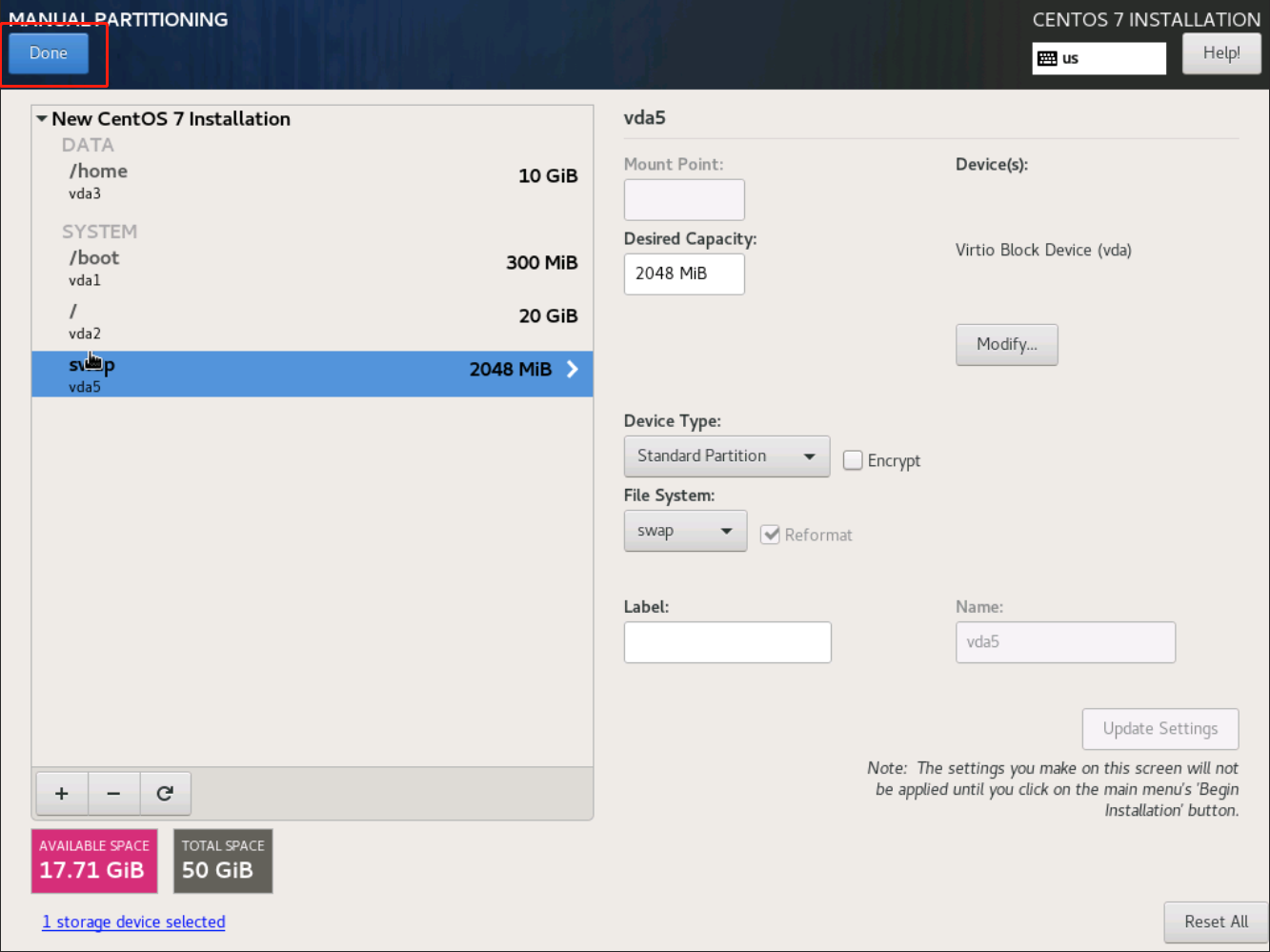 若使用手动分区,点击【I will configure partitioning】选择手动分区,再点击左上角【done】,进入分区界面。