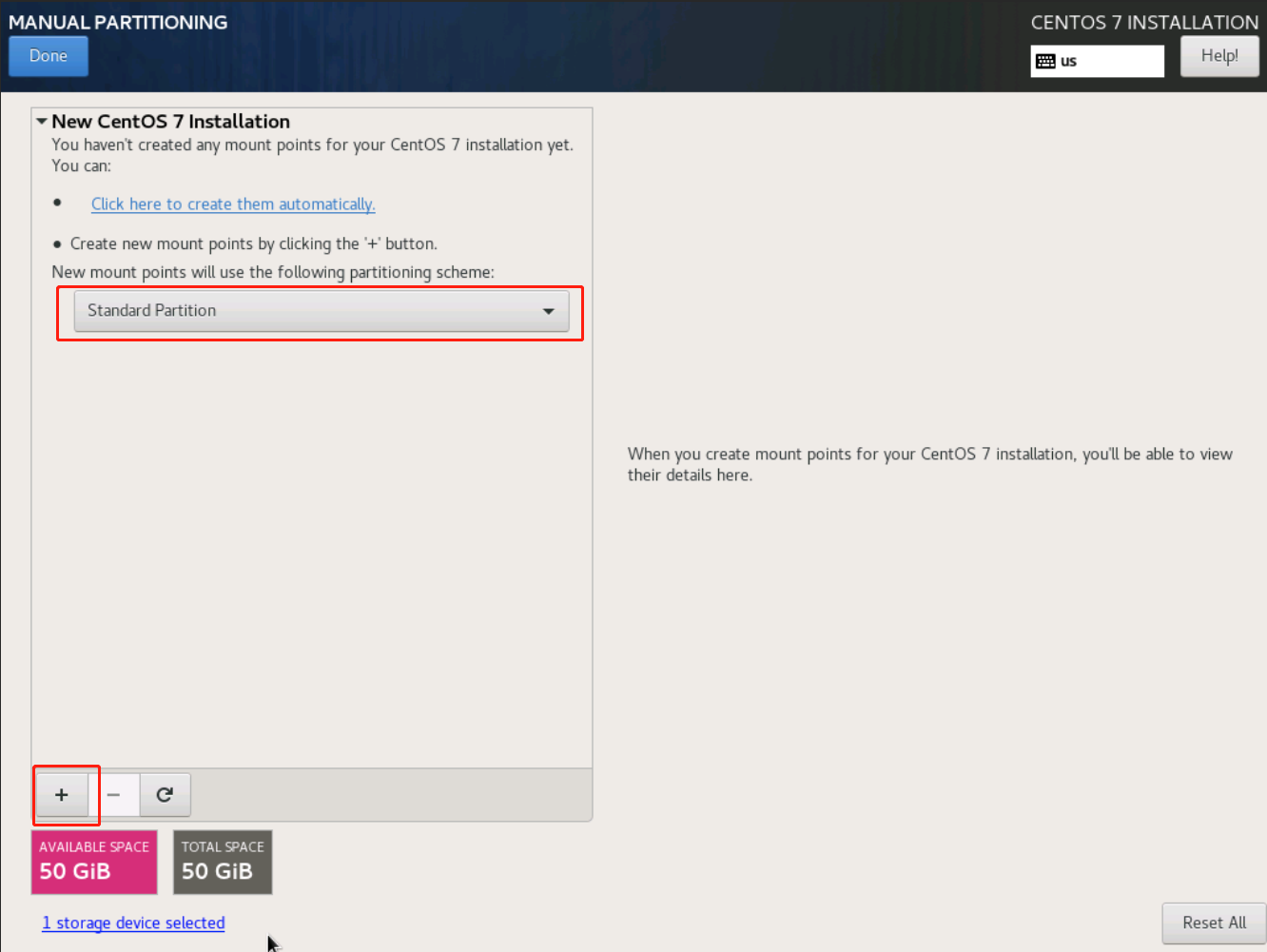 点击分区类型选项,这里选择【Standard Partition】标准分区,然后点击左下角的【+】添加分区。