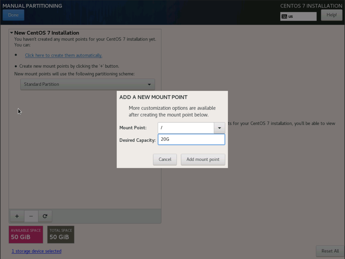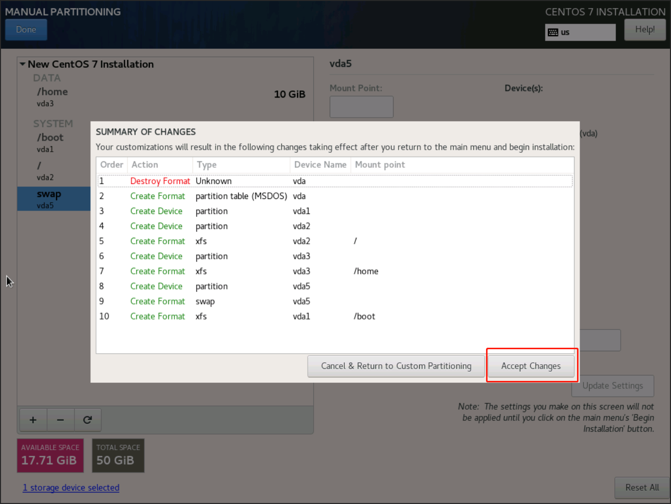 按照需要分别添加根目录、home目录、boot目录并分配空间,添加完成后点击左上角的【done】,之后会出现确认分区划分的提示框,确认无误点击【Accept Changes】保存即可。