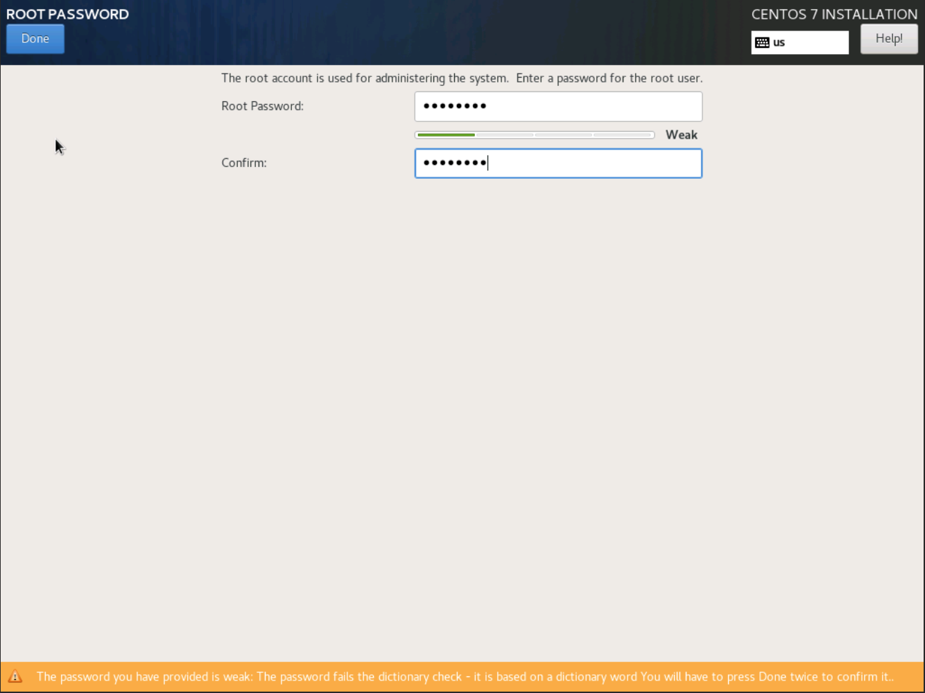 建议设置root密码,设置完成后点击Done,等待系统安装。