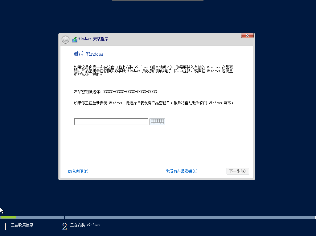 在该界面输入windows系统的产品密钥,点击【下一步】。示例中由于没有密钥,这里点击了没有产品密钥进入下一步。