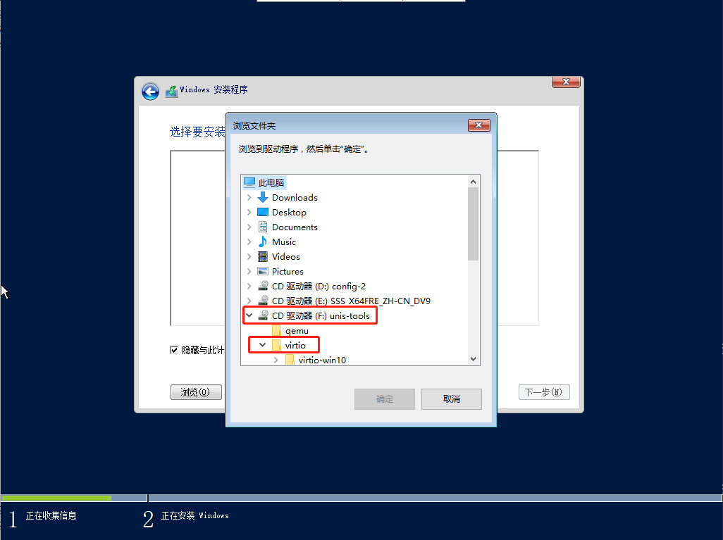 选择【此电脑】下的CD驱动器,驱动器的标签为“unis-tools“,再选择驱动内的”virtio“目录