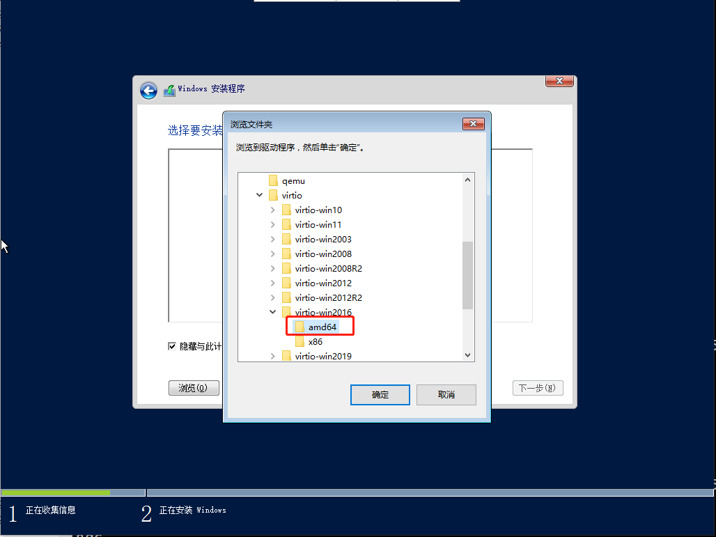 根据安装的系统,点开对应的目录,选择“amd64“文件夹后,点击【确定】按键。