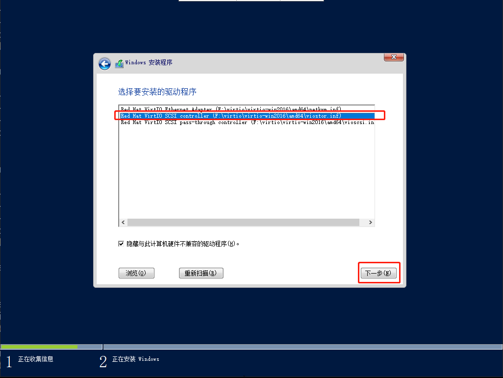 目录中包含的驱动显示在界面上,选择“Red Hat VirtIO SCSI controller“驱动,点击【下一步】。