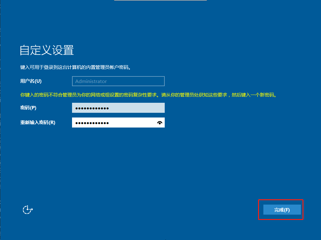 系统安装完成后会自动重启,然后出现一个密码设置的界面,设置完密码之后点击【完成】,即可进入系统中。