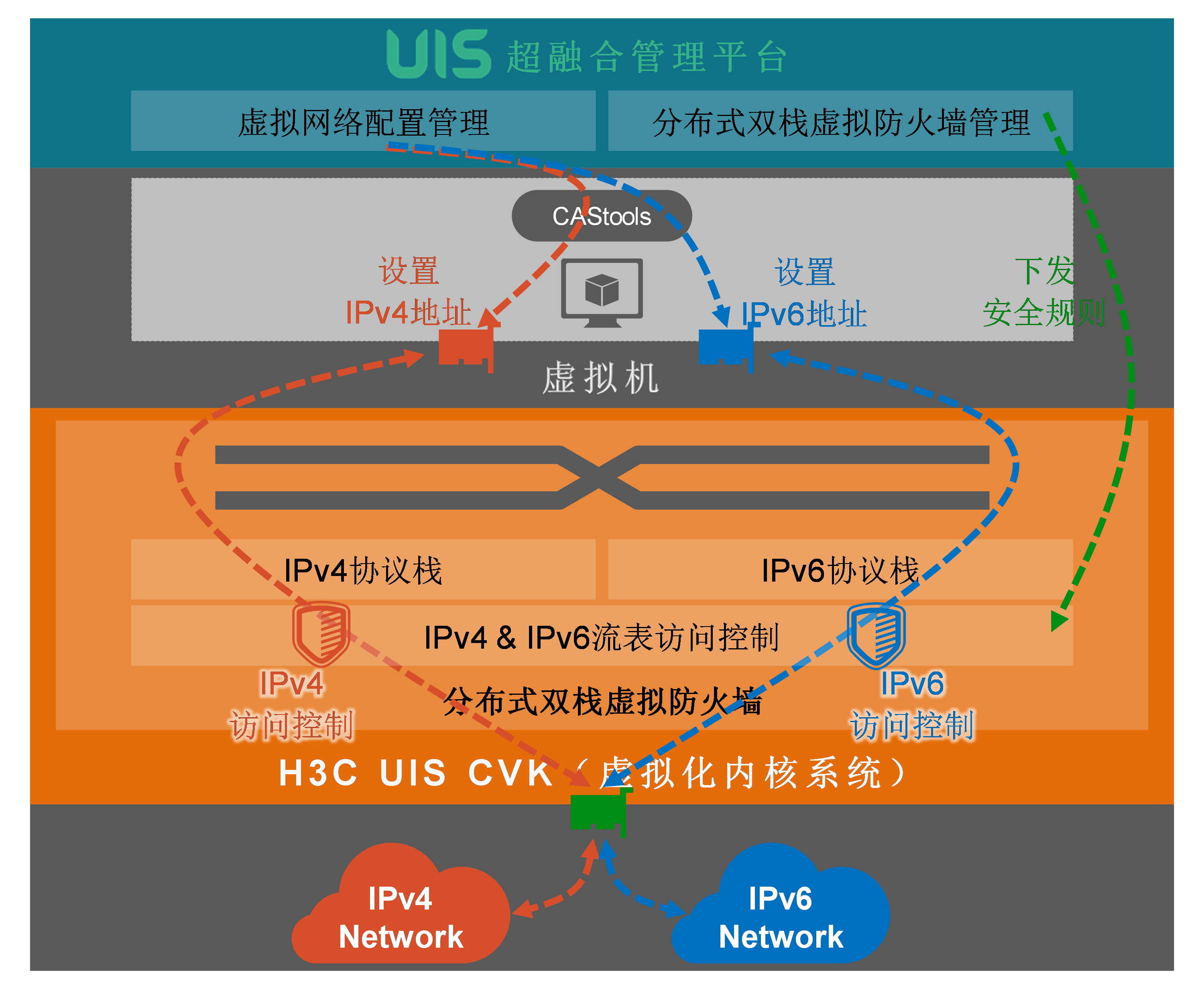 CVK虚拟化内核系统集成了分布式双栈虚拟防火墙,虚拟机业务同时支持IPv4和IPv6两种协议栈,既能与支持IPv4协议的节点通信,又能与支持IPv6协议的节点通信。虚拟机操作系统内的IPv4和IPv6网络地址可以通过手工在虚拟机操作系统内指定,也可以通过H3C UIS超融合管理软件界面配置下发。此时,虚拟机操作系统内的CAStools工具软件会自动设置虚拟网卡的IPv4和IPv6地址。同时,结合客户业务访问控制规则,在H3C UIS超融合管理平台中可以配置符合业务访问控制需求的安全规则,针对HTTP、HTTPS、DNS、SSH、RDP、MySQL等基于状态和连接的常用应用协议进行安全规则配置,并下发到虚拟化主机内核的IPv4和IPv6流表中,当虚拟机业务通过虚拟网卡接收或发送网络流量时,分布式双栈虚拟防火墙将对这些流量进行规则匹配,允许或禁止流量经过,从而实现虚拟机业务访问安全。虚拟机发生迁移后,IPv4和IPv6流表同步跟随,实现网络的随需而动。