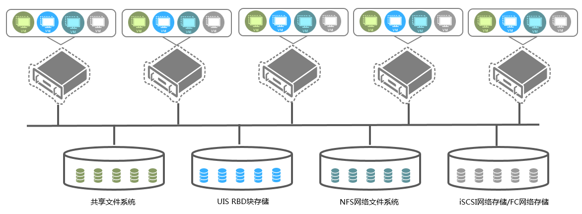 存储池用于管理集群内的共享存储。共享存储是指集群内多个主机同时挂载的存储池。集群的HA、DRS等涉及到虚拟机在线自动迁移的功能都依赖于共享存储。使用共享存储可以保证虚拟机在迁移过程中只涉及计算资源的迁移,不涉及存储资源的迁移,从而节省了迁移所需时间。