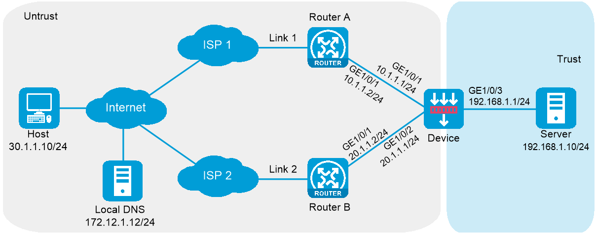 完成上述配置后,当Client Host访问域名l.example.com时,可以解析到10.1.1.1,使用ISP 1的链路访问内网服务器,也可以解析到20.1.1.1,使用ISP 2的链路访问内网服务器。