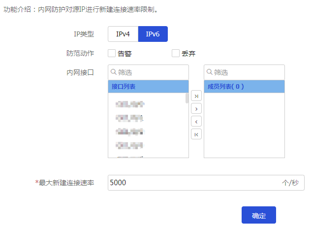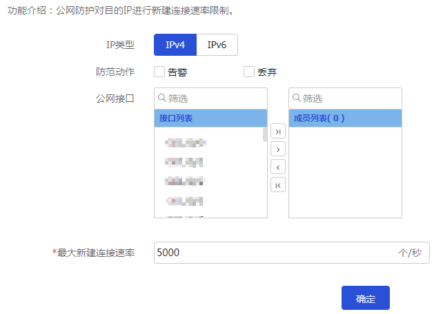 设备支持配置公网防护和内网防护两种类型的新建连接速率限制: