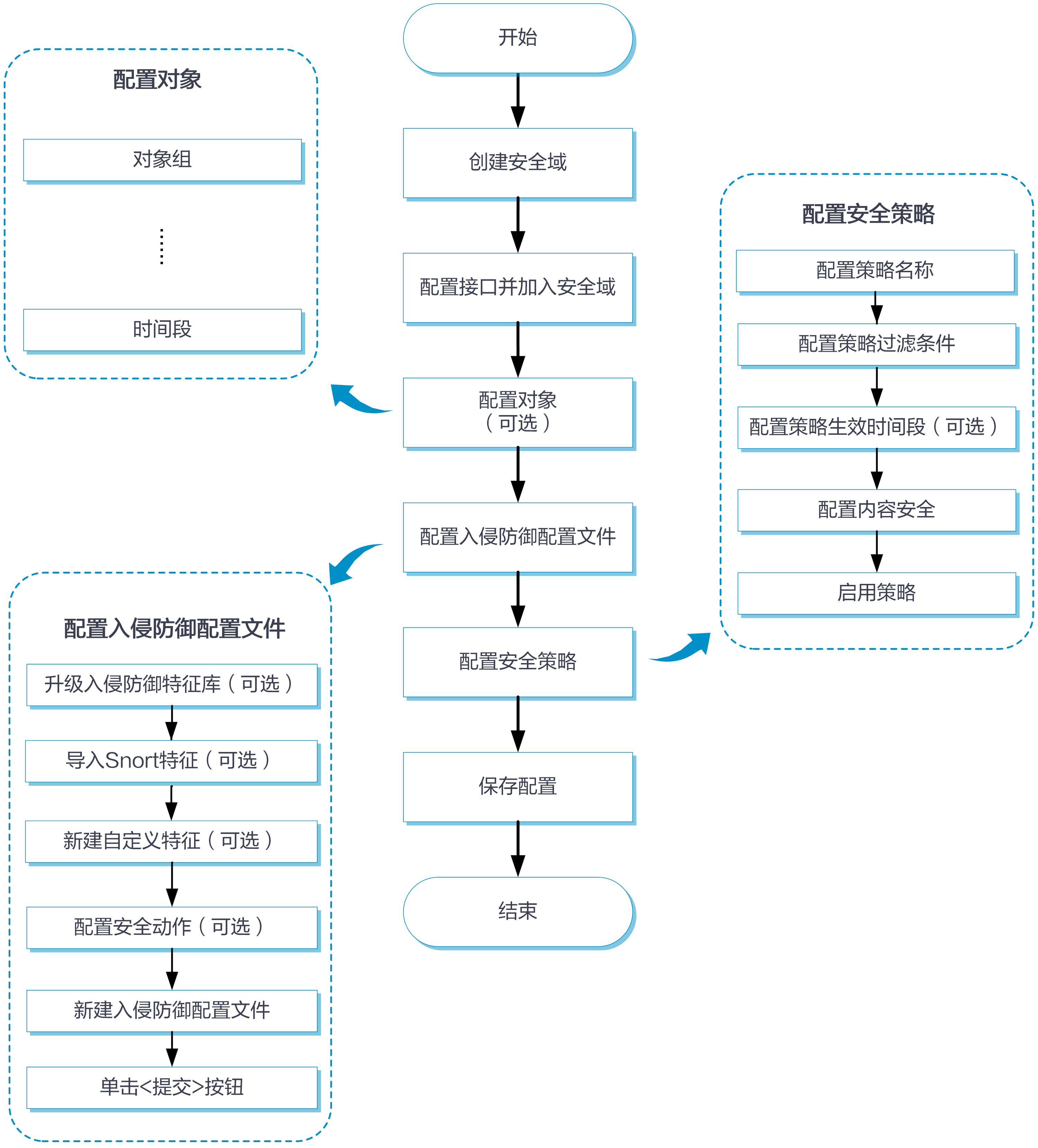 在安全策略的内容安全配置中引用此入侵防御配置文件,具体配置步骤请参见“缺省入侵防御配置任务”章节。
