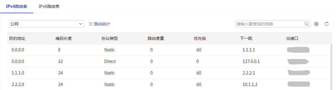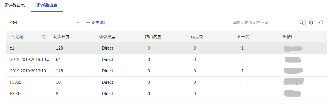 选择“网络 > 路由 > 路由表”,单击“IPv4路由表”或“IPv6路由表”,可实现对IPv4/IPv6路由表概要信息的查看,显示内容如下: