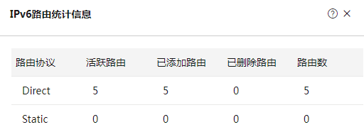 在“IPv4路由表”或“IPv6路由表”页面,单击<路由统计>按钮,可实现对IPv4/IPv6路由表统计信息的查看,统计内容如下: