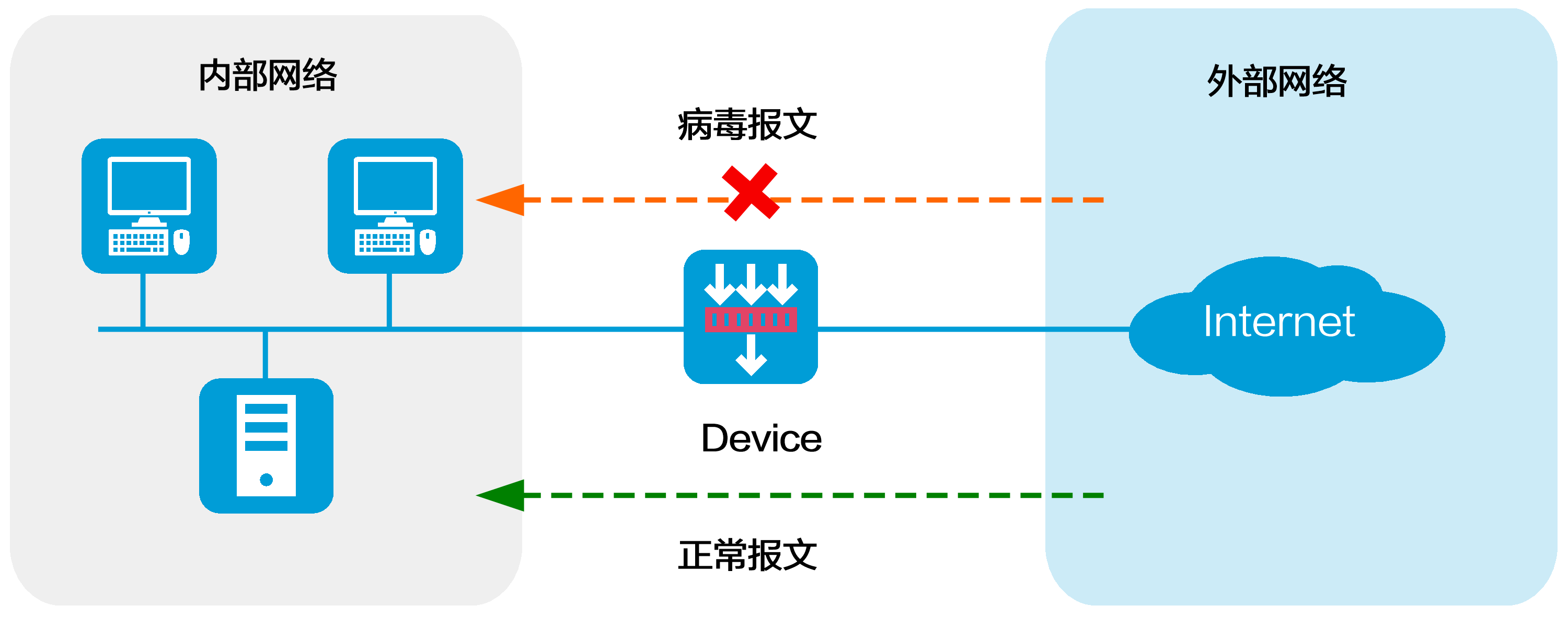如图-1所示,在如下应用场景中,隔离内网和外网的网关设备上需要部署防病毒配置文件来保证内部网络安全: