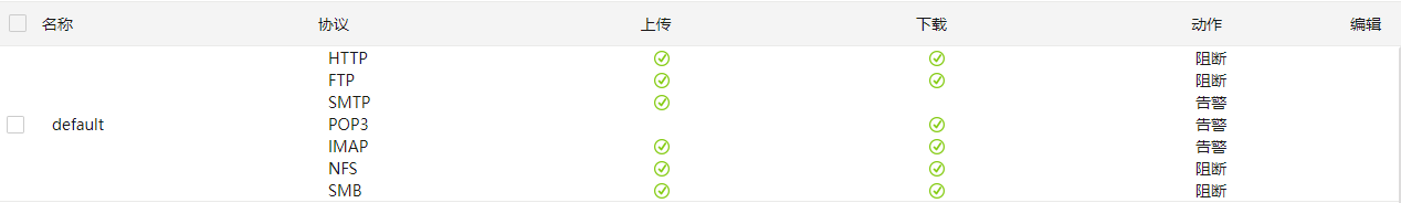 上传 | 对HTTP、FTP、SMTP、NFS、SMB和IMAP协议上传方向的报文进行病毒检测。其中,SMTP协议只支持上传方向 |