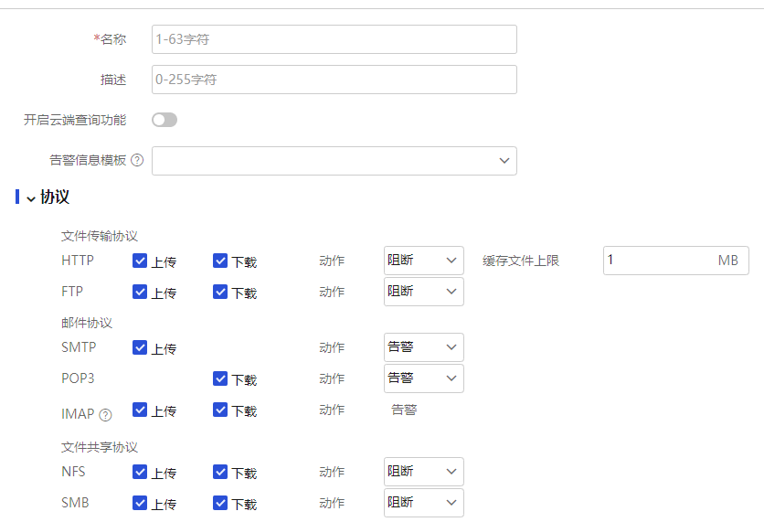缓存文件上限 | 表示缓存的待检测文件大小 仅当配置HTTP协议的上传或下载方向的动作为阻断时支持 |