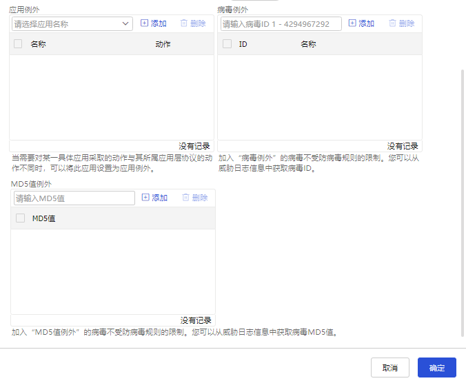 MD5值例外 | 如果发现某类检测出病毒的报文被误报时,用户可以通过查看威胁日志获取病毒的MD5值,并将该MD5值设置为例外。当后续再有检测出符合该MD5值的报文通过时,设备将对其执行允许动作 |
