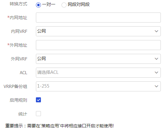 VRF | 配置转换后源地址所属的VPN。缺省为“公网”,表示不属于任何一个VPN 在VPN组网中,该项必须配置,且VPN实例的名称必须与该接口关联的VPN实例一致 |