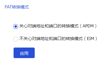 选择<全局配置>页签,选择PAT转换模式,并单击<应用>,使用指定的PAT模式转换报文。
