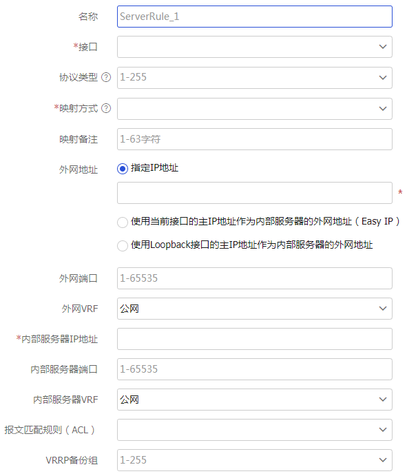 内部服务器VRF | 内部服务器所属的VPN 缺省值为“公网”,表示内部服务器不属于任何一个VPN | |