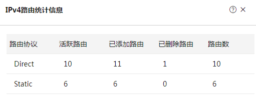 在“IPv4路由表”或“IPv6路由表”页面,单击<路由统计>按钮,可实现对IPv4/IPv6路由表统计信息的查看,统计内容如下: