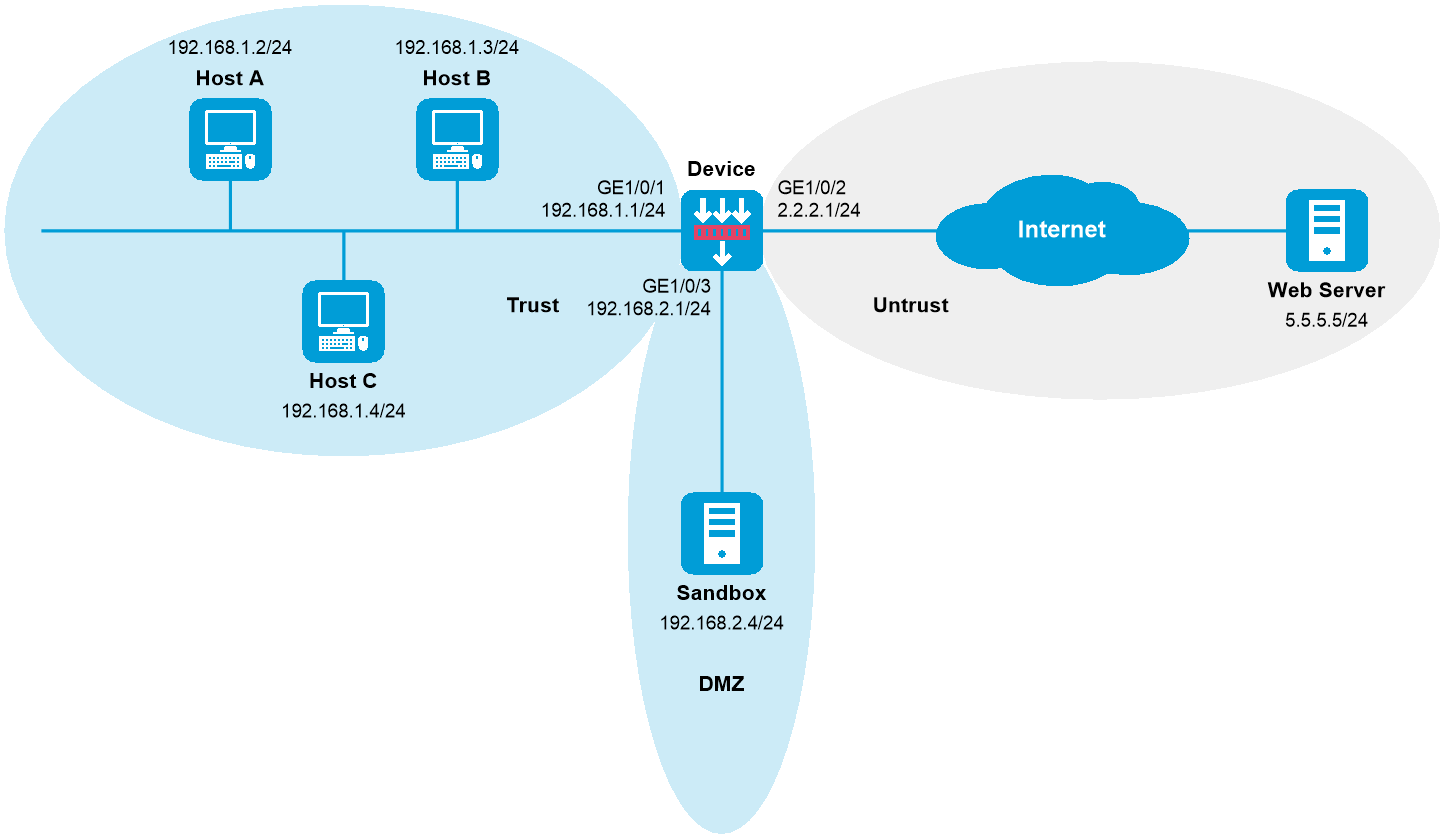 如下图所示,Device分别通过Trust安全域和Untrust安全域与局域网和Internet相连。企业内网中部署了沙箱,且沙箱与Device路由可达。现需要Device与沙箱联动,保护内网用户免受APT攻击,当沙箱检测到APT攻击时,对攻击流量执行阻断操作。