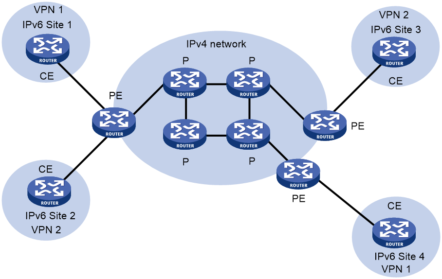 6vPE即IPv6 MPLS L3VPN,其典型组网环境如图-1所示。6vPE组网中,服务提供商骨干网为IPv4网络。VPN内部及CE和PE之间运行IPv6协议,骨干网中PE和P设备之间运行IPv4协议。PE需要同时支持IPv4和IPv6协议,连接CE的接口上使用IPv6协议,连接骨干网的接口上使用IPv4协议。