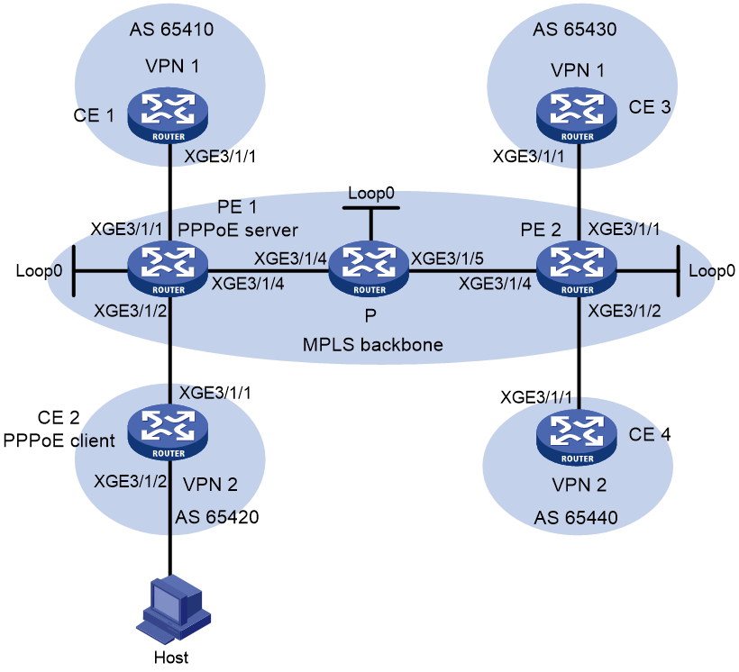 图-2 6vPE场景下IPv6用户采用PPPoE接入配置组网图